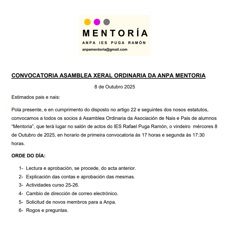 INFORMACIÓN ANPA: REUNIÓN MENTORIA OUTUBRO 2025